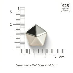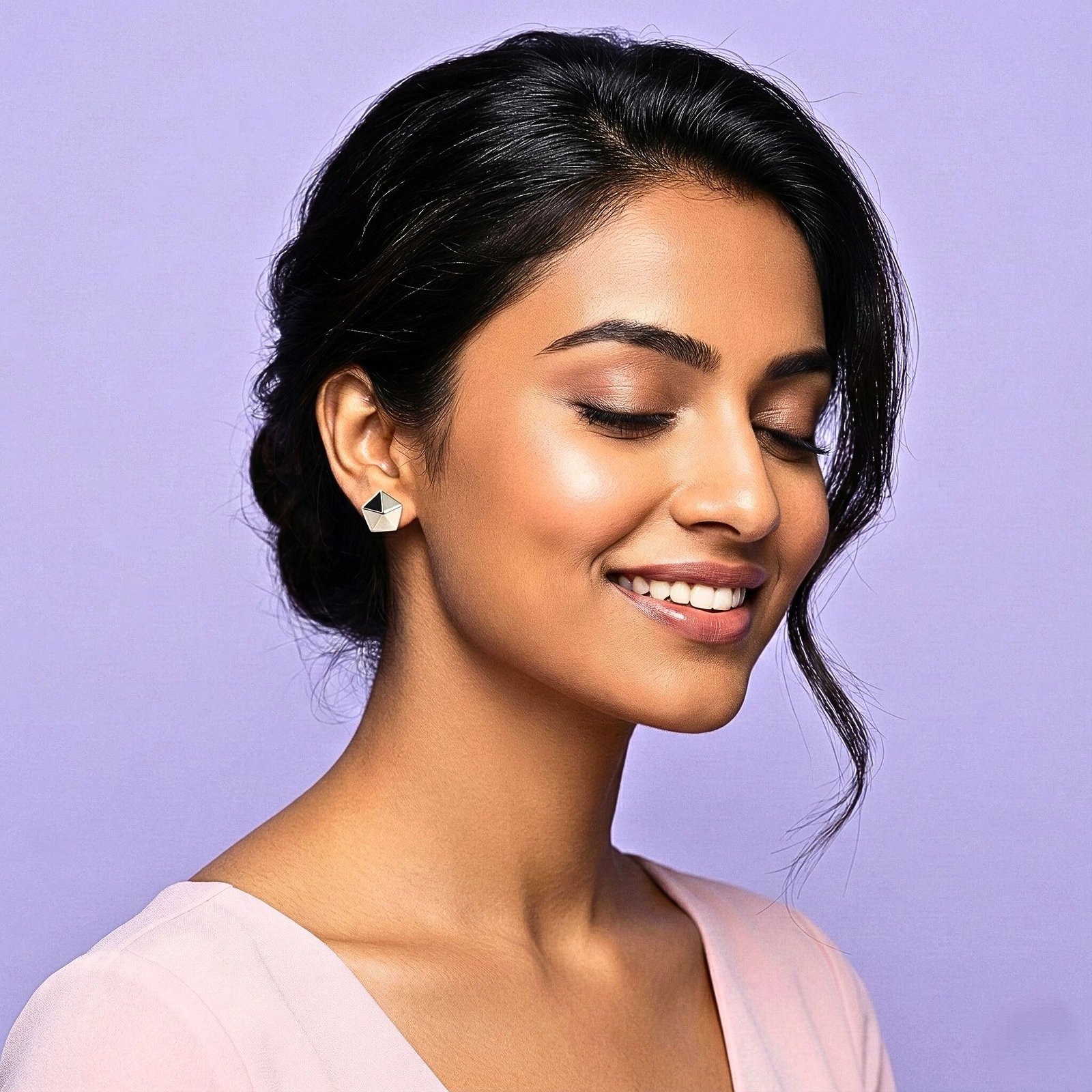 Molded from high-quality sterling silver, each earring mimics the shape of a dodecahedron face, rising into a subtle 3D peak. The mirror-like finish amplifies their shine, making them small enough for office wear but brilliant enough to spark conversation at a dinner party.