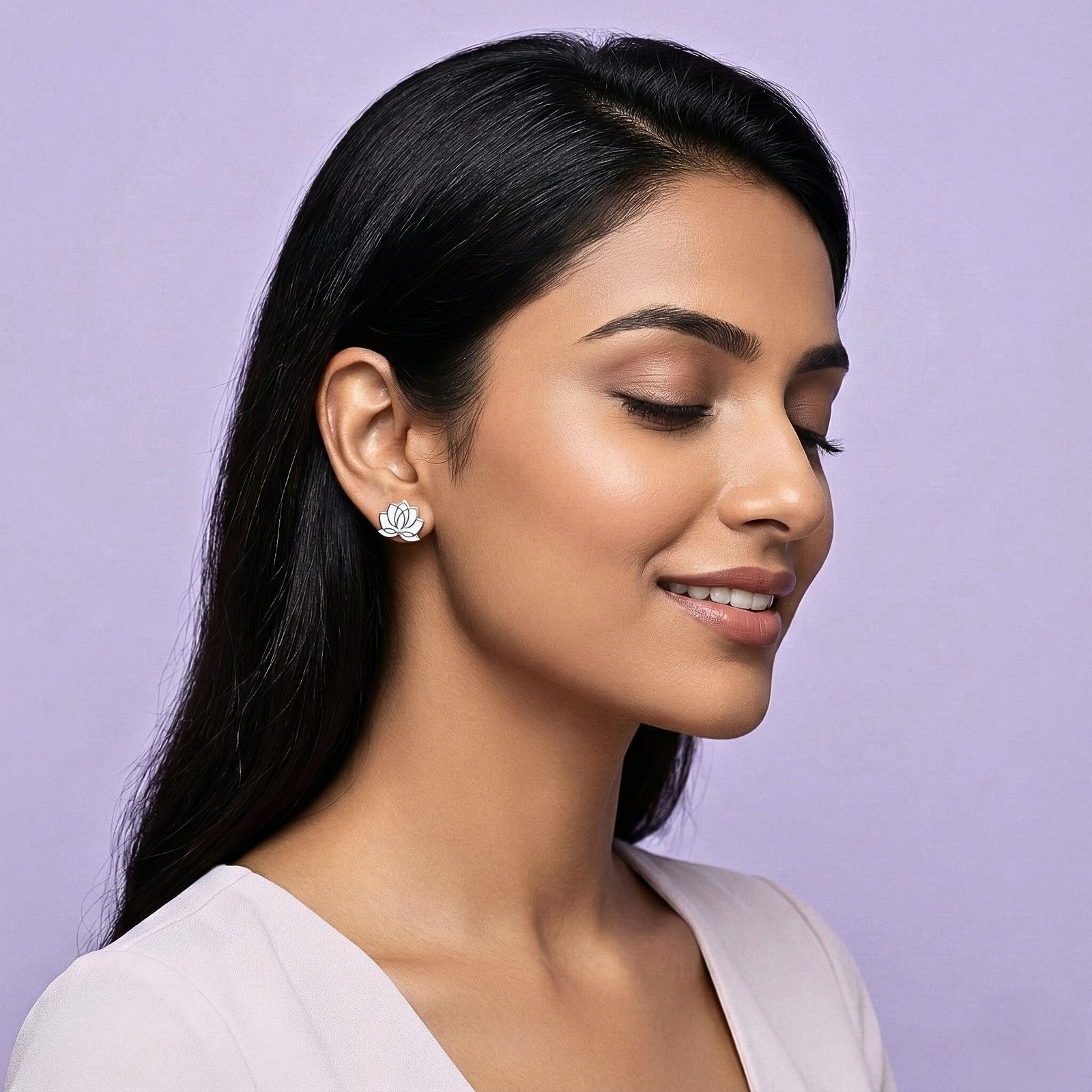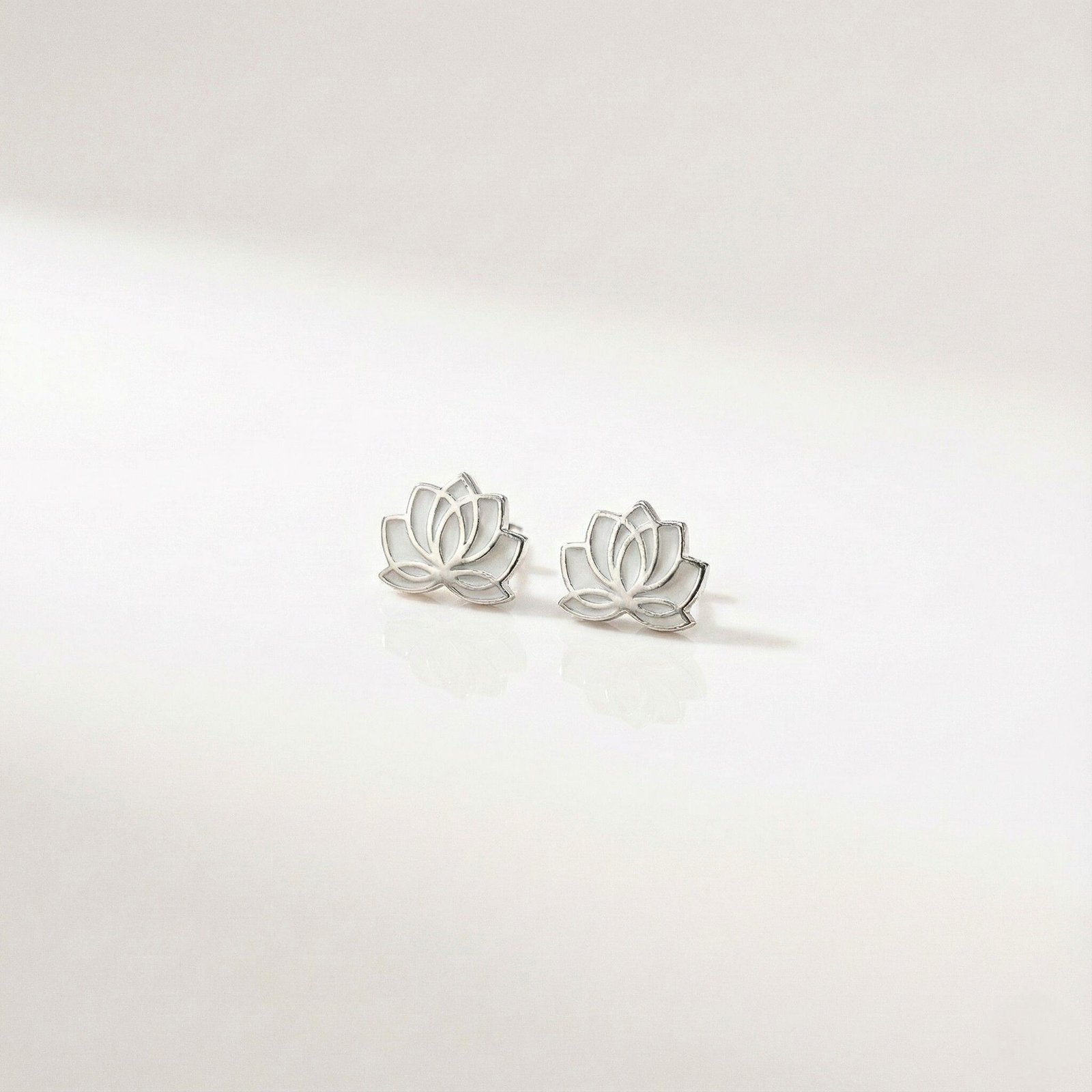 Expertly crafted from high-quality silver, each earring features a symmetrical lotus motif. The petals are filled with a smooth, glossy white enamel, creating a stunning contrast against the gleaming silver borders. This monochromatic palette makes them incredibly versatile—understated enough for office wear yet elegant enough to pair with a cocktail dress.