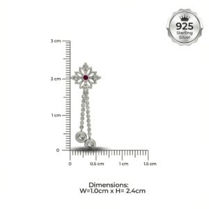 At the stud, an intricately designed, eight-pointed openwork flower sits securely on the earlobe. Pave-set with brilliant clear stones, the petals frame a striking, deep red simulated ruby at the center, offering a passionate pop of color against the cool tones of the silver.